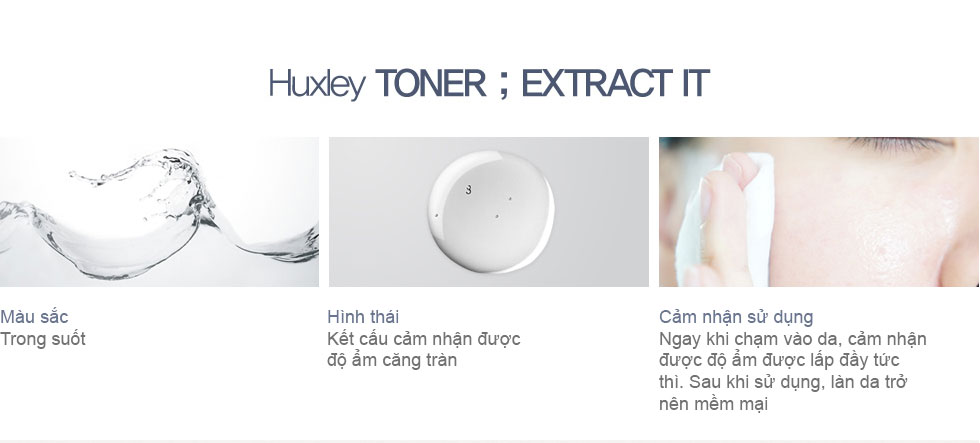 Huxley Toner Extract It với chiết xuất từ hạt xương rồng hữu cơ, có chứa chất Aquacacteen giúp làm dịu làn da bị dị ứng, đặc tính dưỡng ẩm tuyệt vời do chứa hàm lượng cao các hợp chất giữ nước.